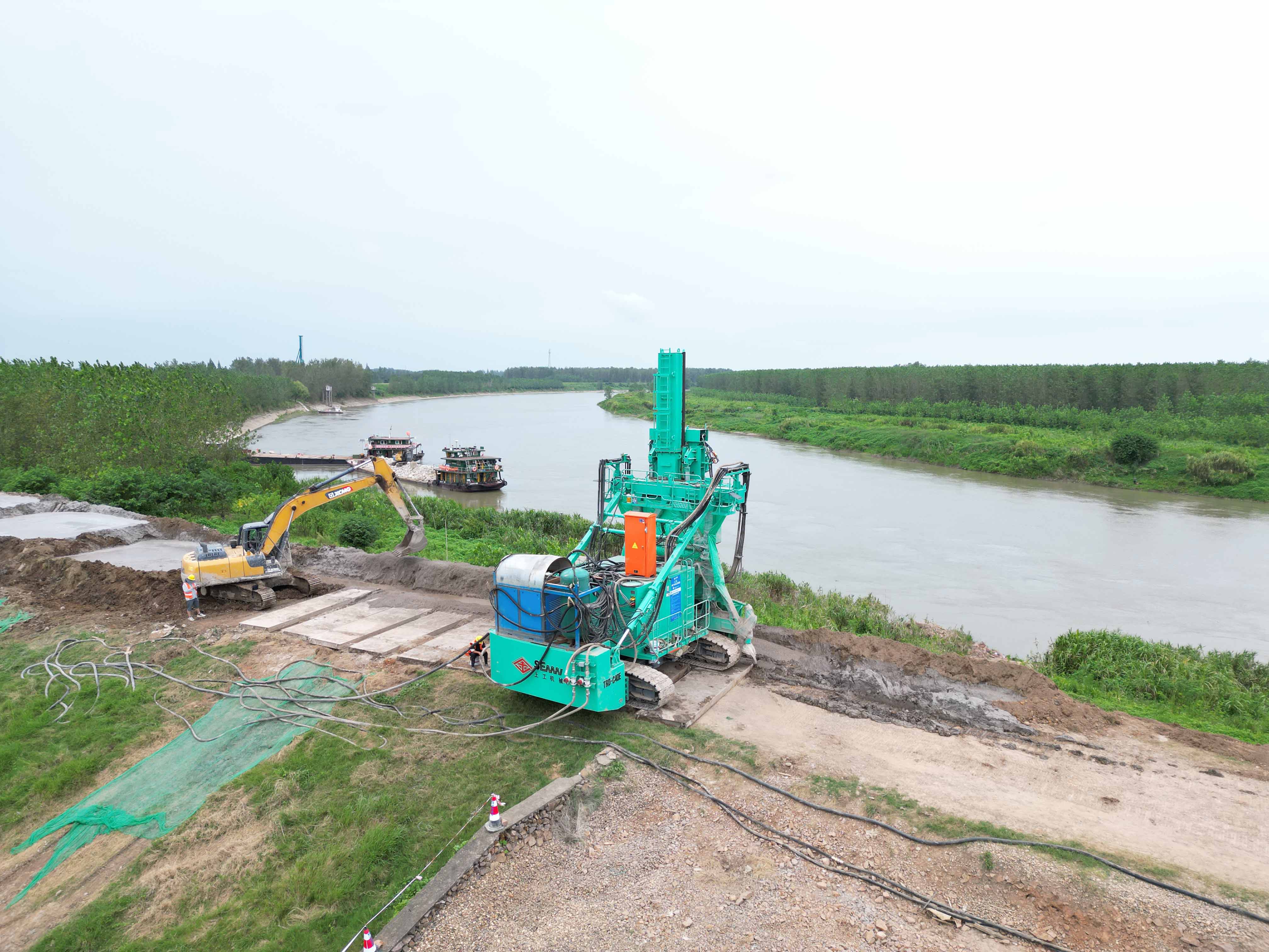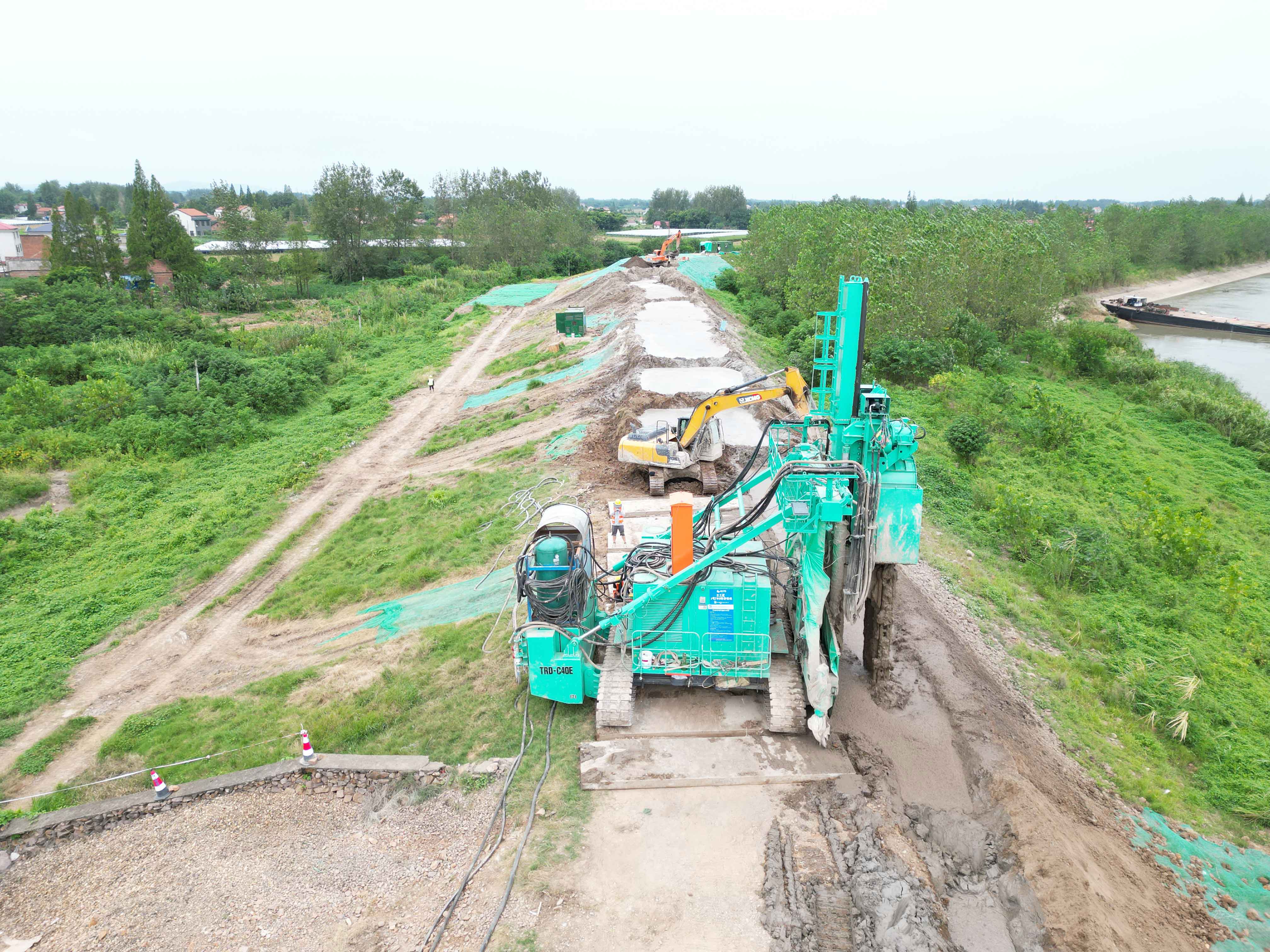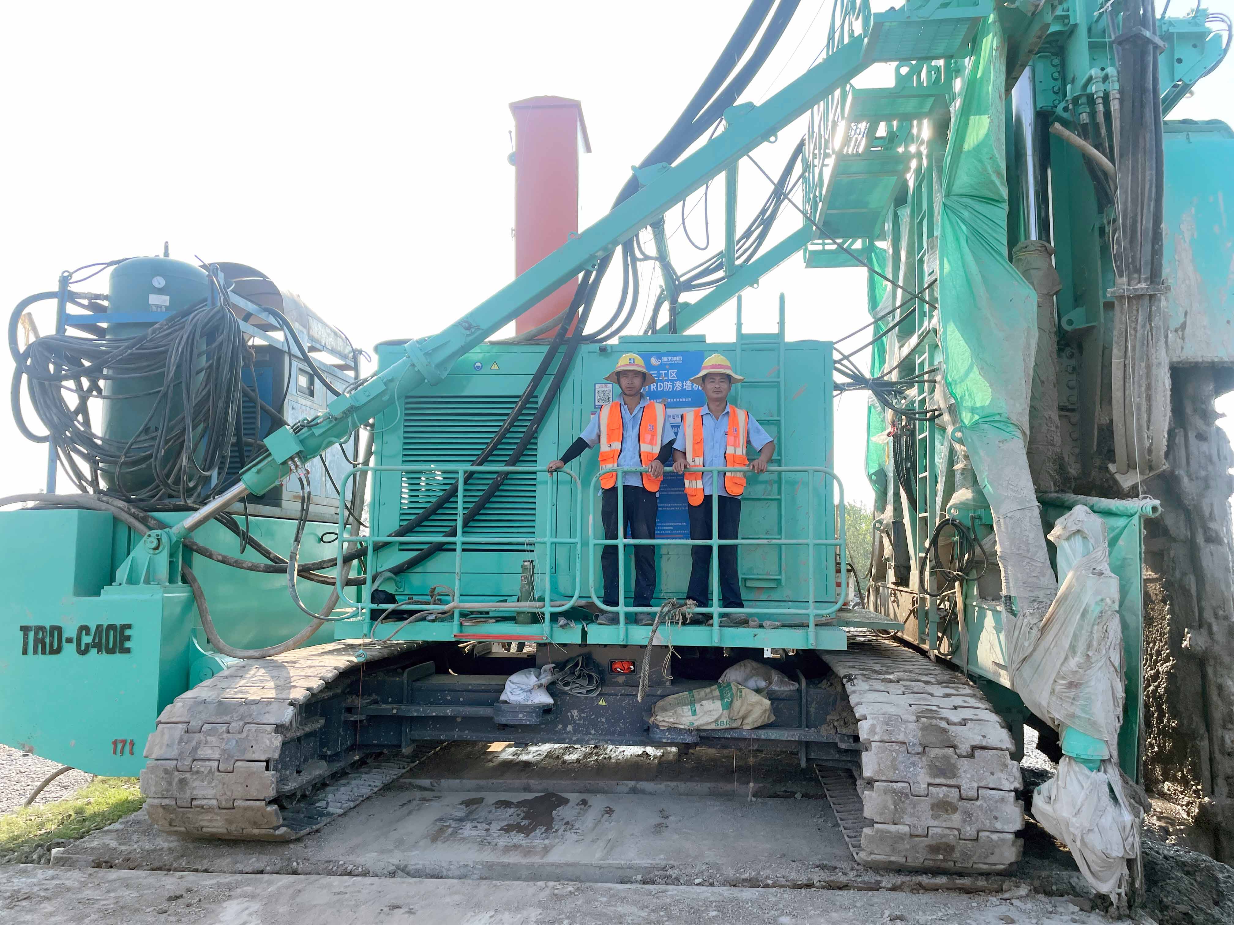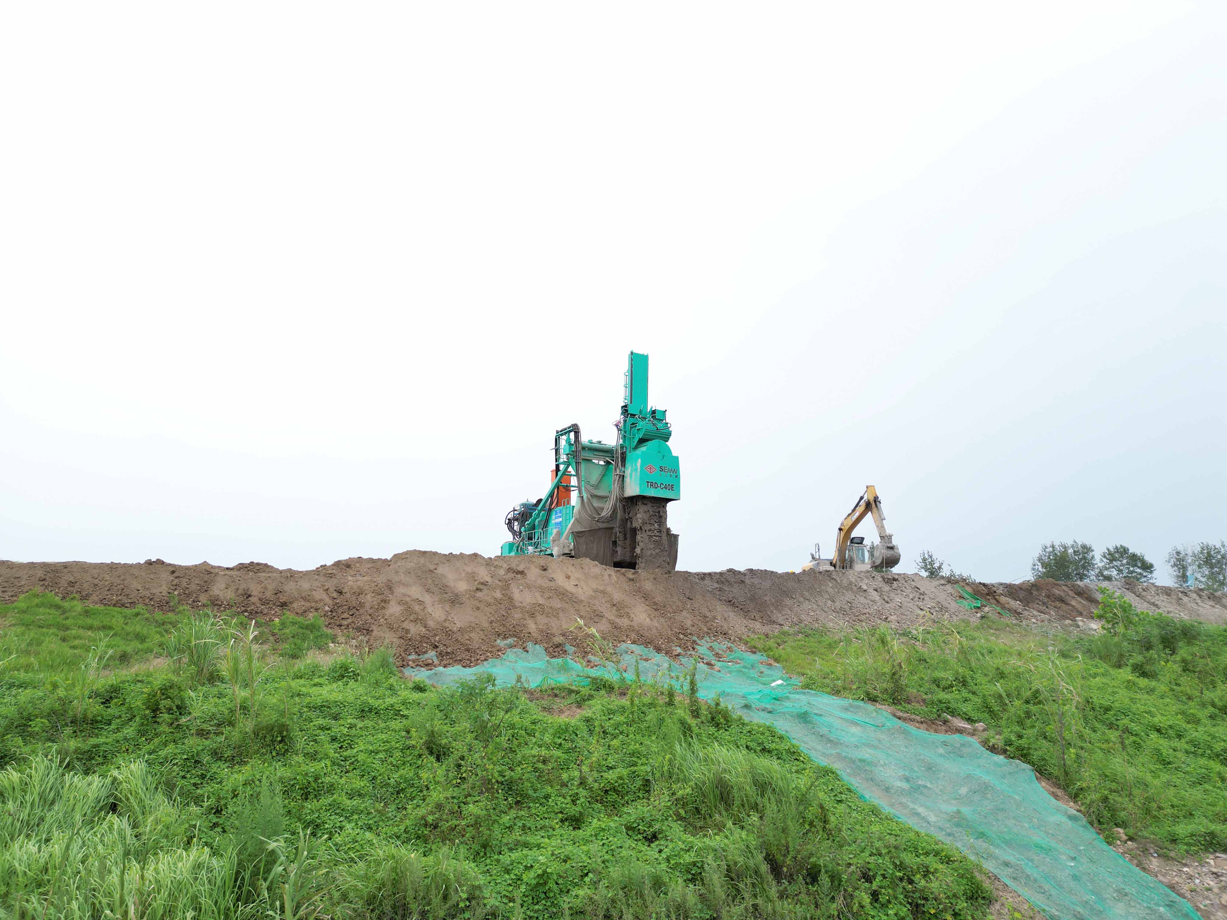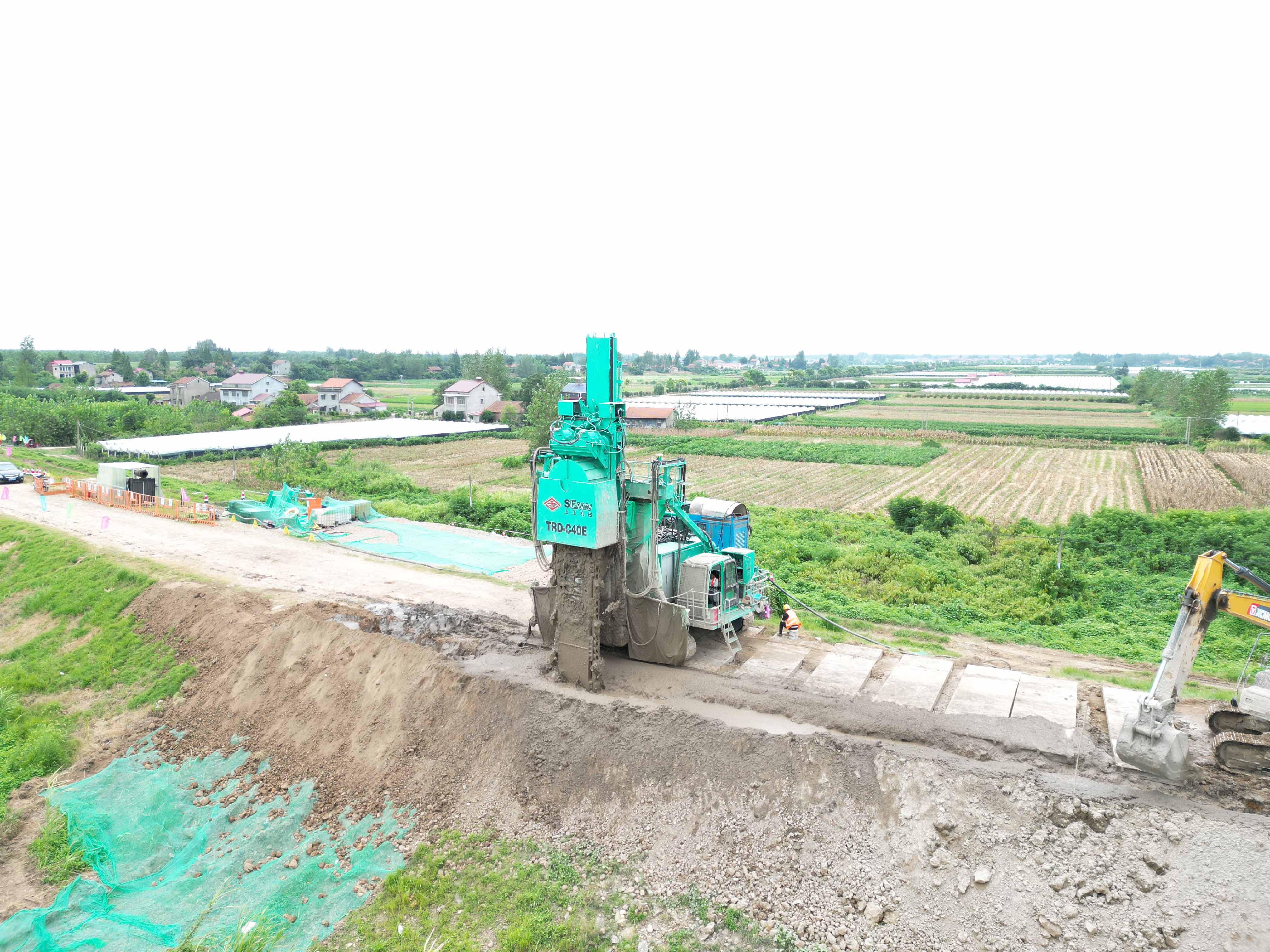 上工機械首台純電驅動TRD-C40E工法機完成(chéng)下線後(hòu),首次出征,直抵洞庭湖區松遭烷一線防洪大堤,在窄小的堤壩上進(jìn)行深度32m,牆厚550mm的多段止水帷幕連續牆施工。實地現場,TRD-C40E工法機憑借著(zhe)優異的實戰表現成(chéng)爲大堤上一道(dào)亮麗的風景線。