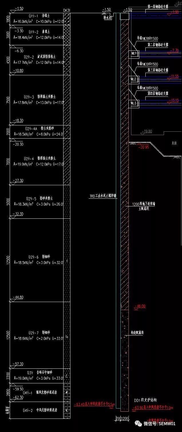該項目基坑面(miàn)積達6萬多平方米,大部分區域爲4層地下室,深度約22m,局部深坑深達30m,住宅區域局部2層~3層地下室。項目鄰近地鐵,地質條件極差,地下水豐富,爲保護地鐵,TRD工法機施工深度爲61.5米,槽寬700mm,入岩1m。本項目地質條件非常複雜,施工難度極大,地下-56至-58米是鵝卵石層、-58至-60米左右是強風化層、-60米以下是中風化層,這(zhè)是迄今爲止TRD工法施工史上少有的高難度項目。