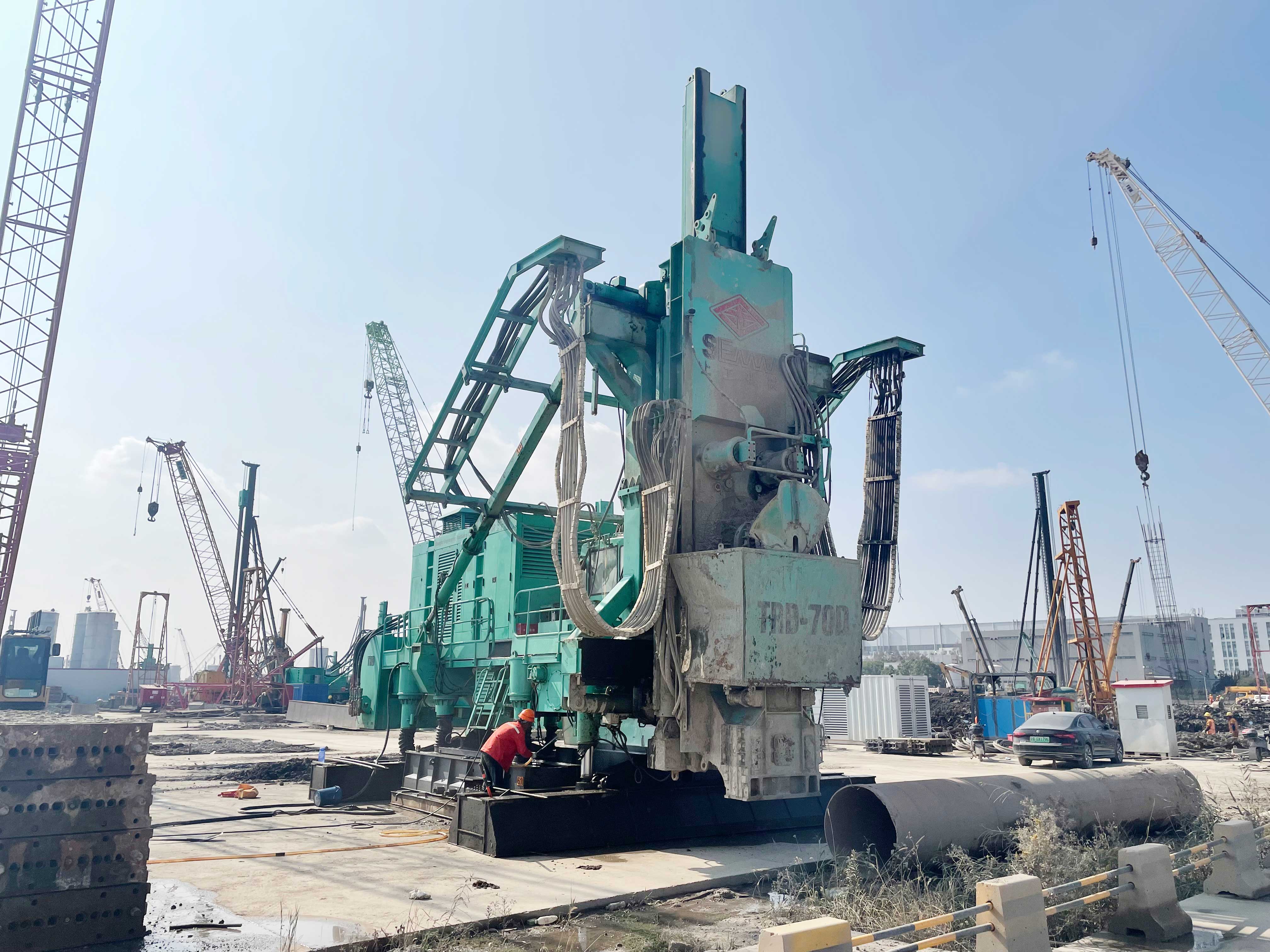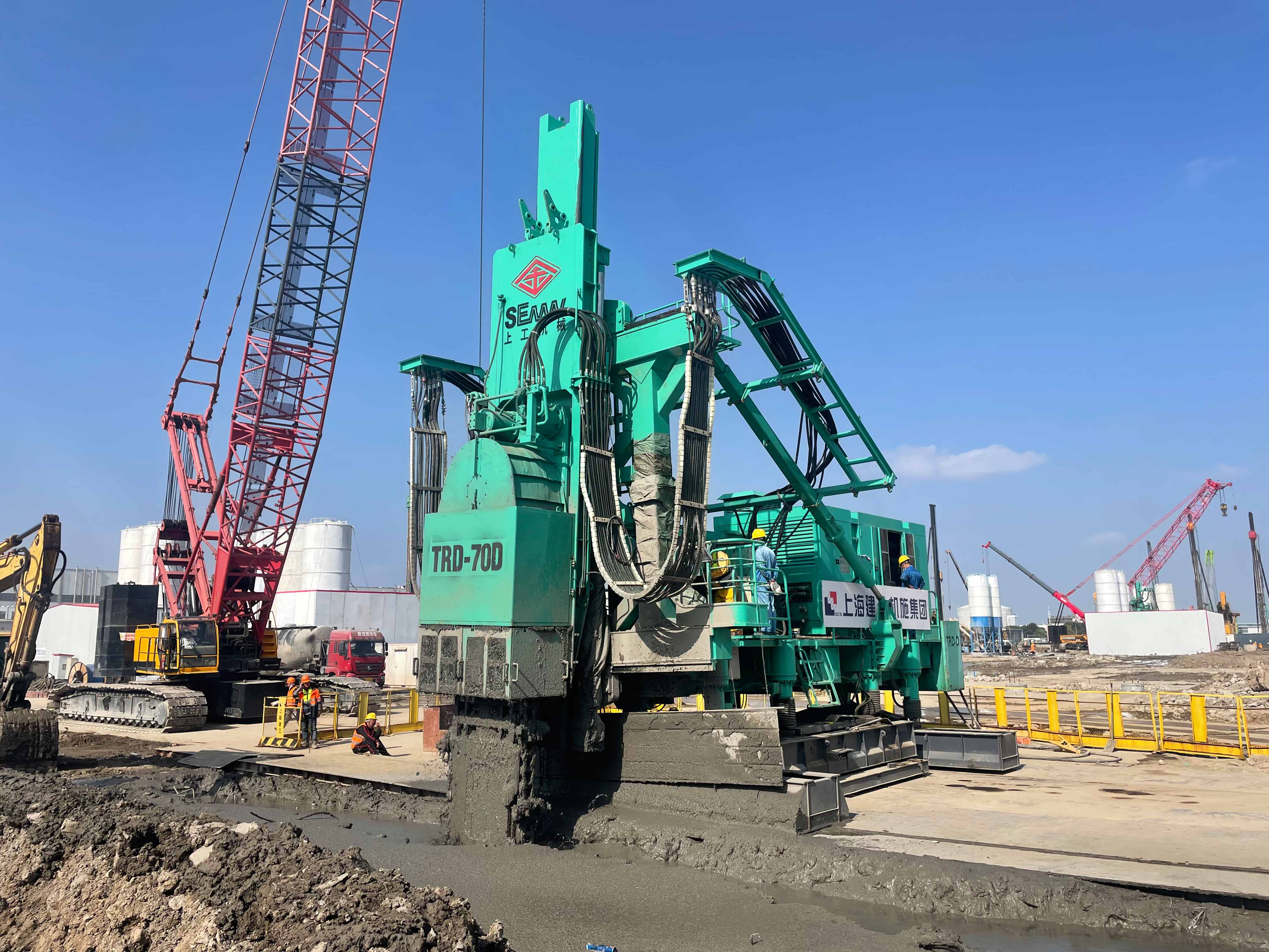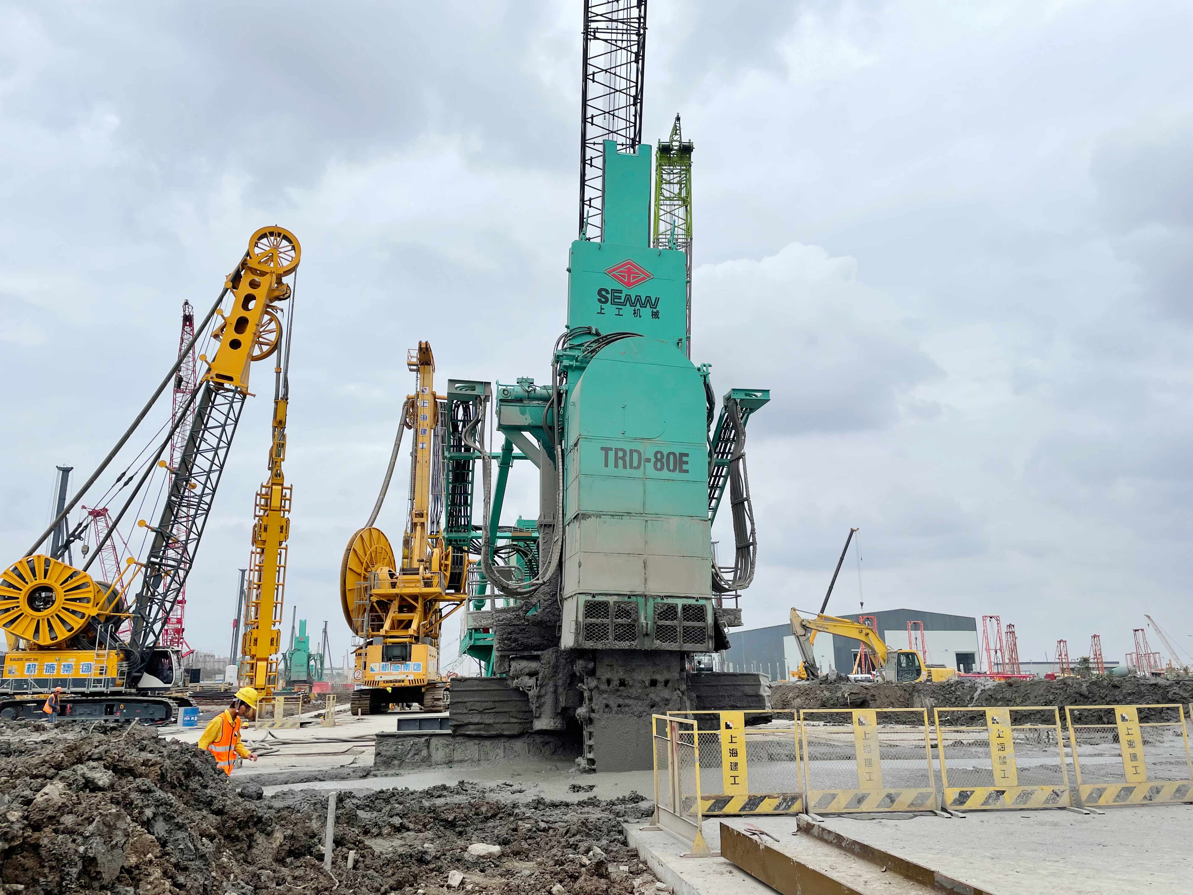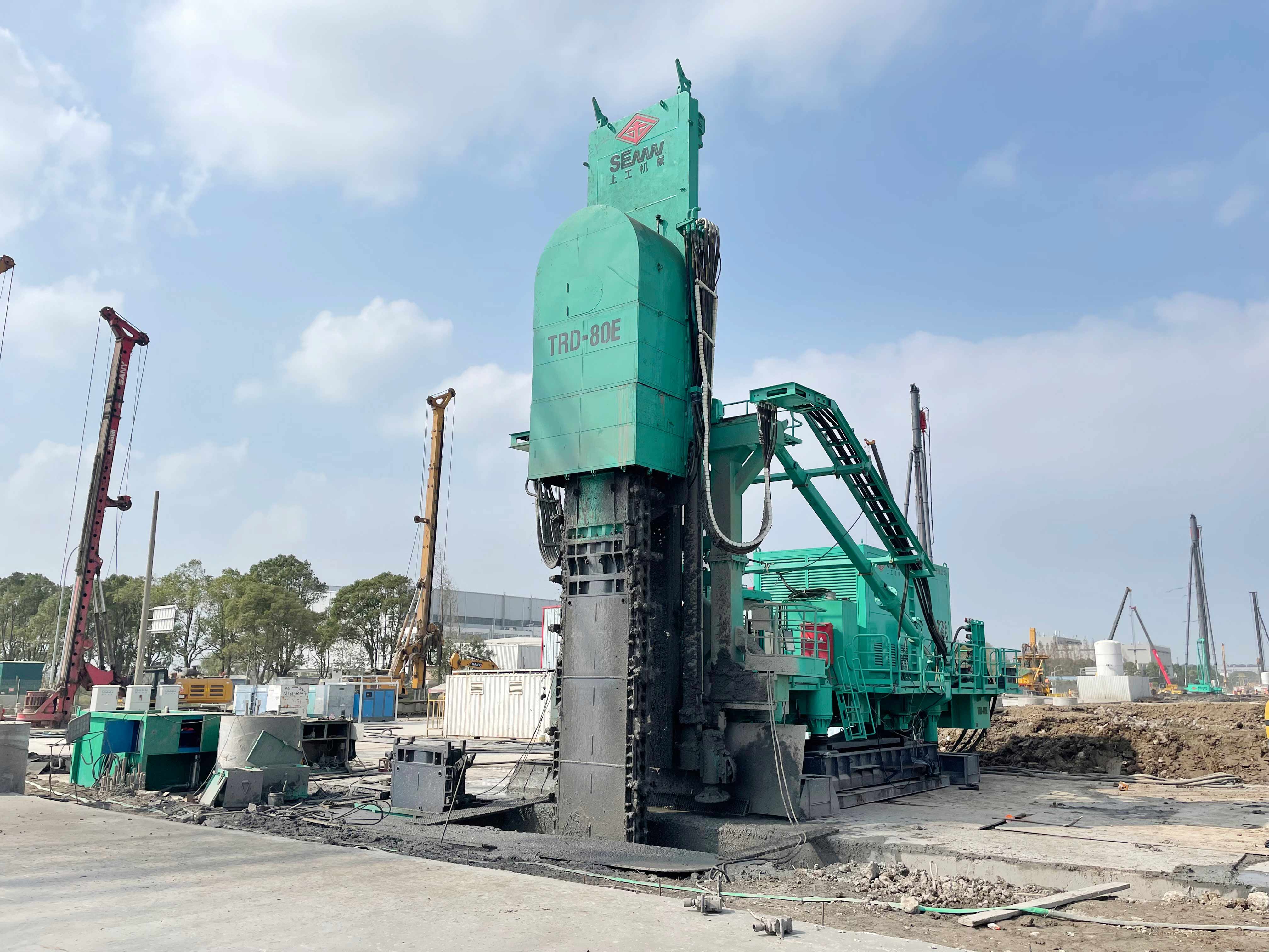 近階段,上工機械TRD工法機助力任務是工程基坑開(kāi)挖前做多段止水帷幕連續牆作業,該項目TRD施工總方量約21萬方,核心區基坑連續牆長(cháng)度爲8767m,TRD止水帷幕長(cháng)度爲5745m,成(chéng)牆厚度分别爲800mm和900mm,牆體深度爲40m-75m,項目要求等厚度水泥攪拌牆的垂直度不大于1/300,牆位偏差不大于50mm,成(chéng)牆厚度偏差不大于20mm,牆深、牆厚不得出現負偏差,對(duì)施工技術與設備有著(zhe)極高的要求。