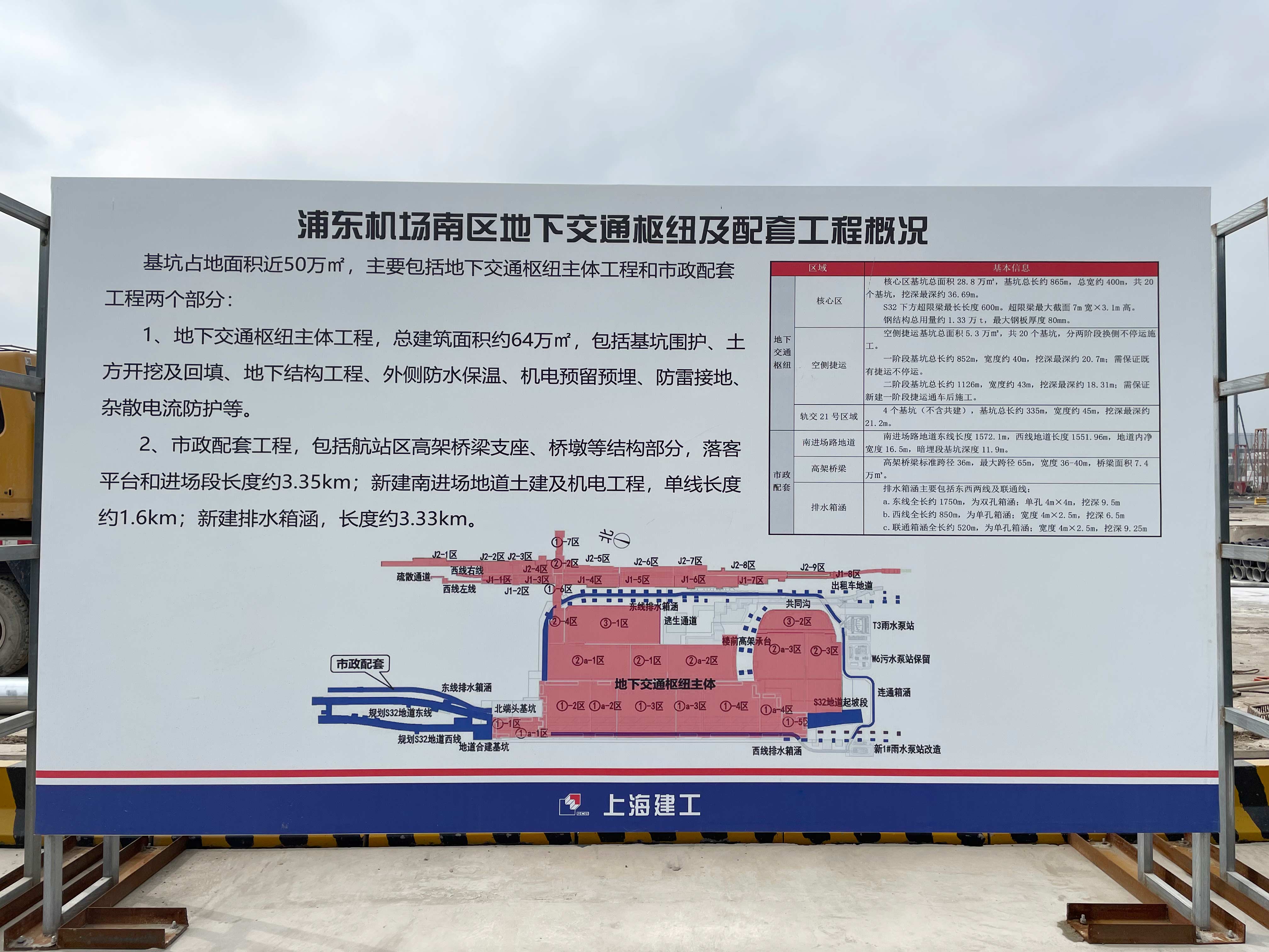 浦東機場南區地下交通樞紐及配套工程位于上海市浦東新區,浦東機場捷運區以西、飛翺路以東、浦東機場衛星廳以南和圍場河路以北。工程建設範圍東至第二跑道(dào)第三平滑,西至飛翺路,南至現狀圍場河,北至南垂滑最南側滑行道(dào)51米處,項目總投資580億元,總建築面(miàn)積64萬平方米,基坑面(miàn)積近50萬平方米。