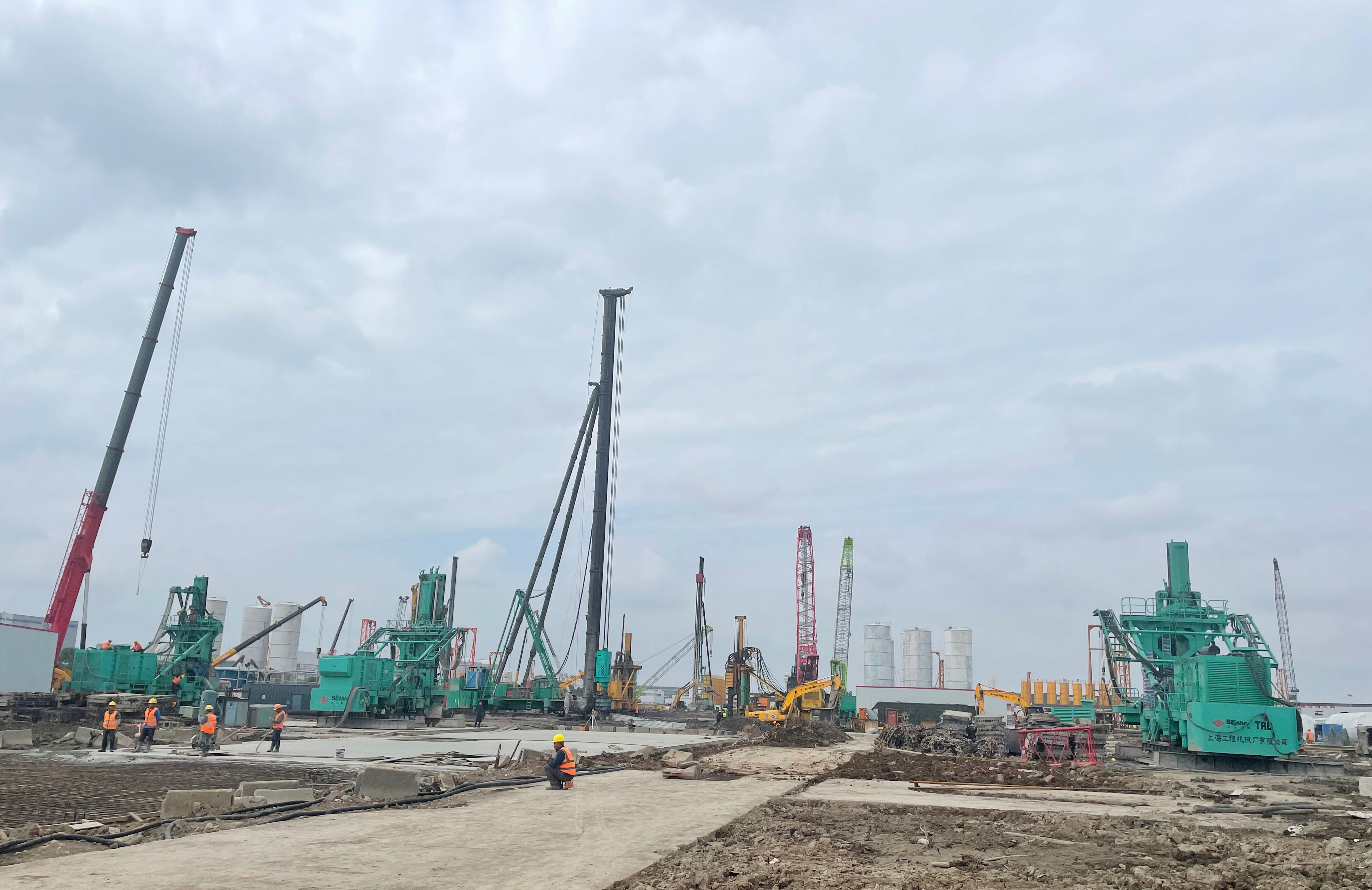 同時(shí),爲達到此次項目超深工程施工要求,工程現場還(hái)集結有上工機械8套SMW工法設備——JB系列打樁架+ZLD超深三軸式連續牆鑽孔機,現場主要任務是基坑内地基加固,現場與10台上工機械TRD設備同時(shí)施工,遠遠望去,滿場盡是上工綠,組成(chéng)浦東機場最美的綠色風景線。