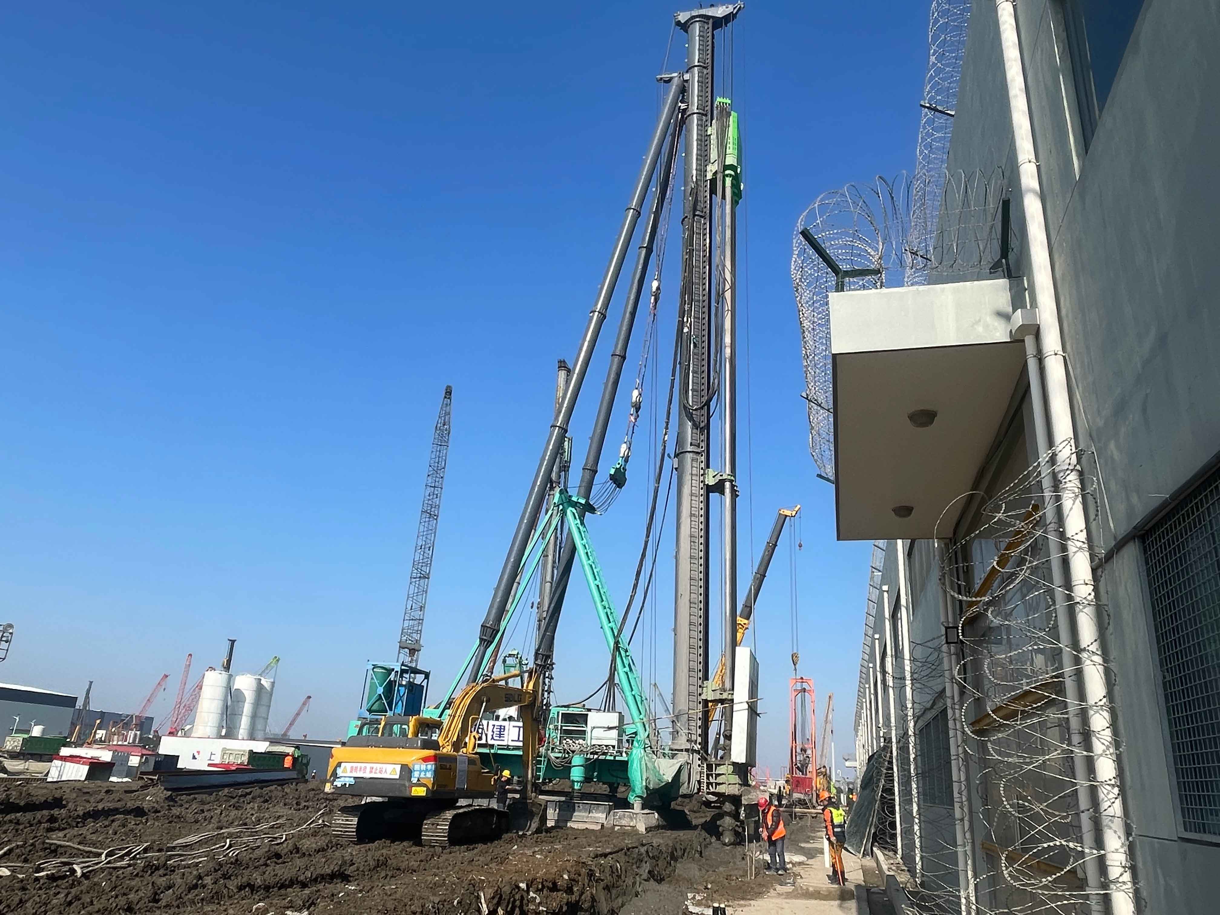 該項目TRD施工總方量約21萬方,目前已聚集上工機械10餘台TRD工法機進(jìn)行基坑開(kāi)挖前做多段止水帷幕連續牆作業,爲了保證飛機場捷運區地鐵2号線正常運作,在距離地鐵維修車間3米,由華東建築設計院和上海申元岩土工程有限公司設計雙排微擾動四軸攪拌止水樁,中間套打灌注樁以保證開(kāi)挖後(hòu)地基不移位,四軸攪拌樁延長(cháng)米180米,雙排360米,深度19.5米,開(kāi)挖深度10米,水泥參量15%,水灰比1:1,項目要求止水攪拌樁的垂直度不大于1/300,牆位偏差不大于50mm,成(chéng)牆厚度偏差不大于20mm,牆深、牆厚不得出現負偏差,設備12小時(shí)做樁10-12根樁,對(duì)施工技術與設備性能(néng)有著(zhe)極高的要求。