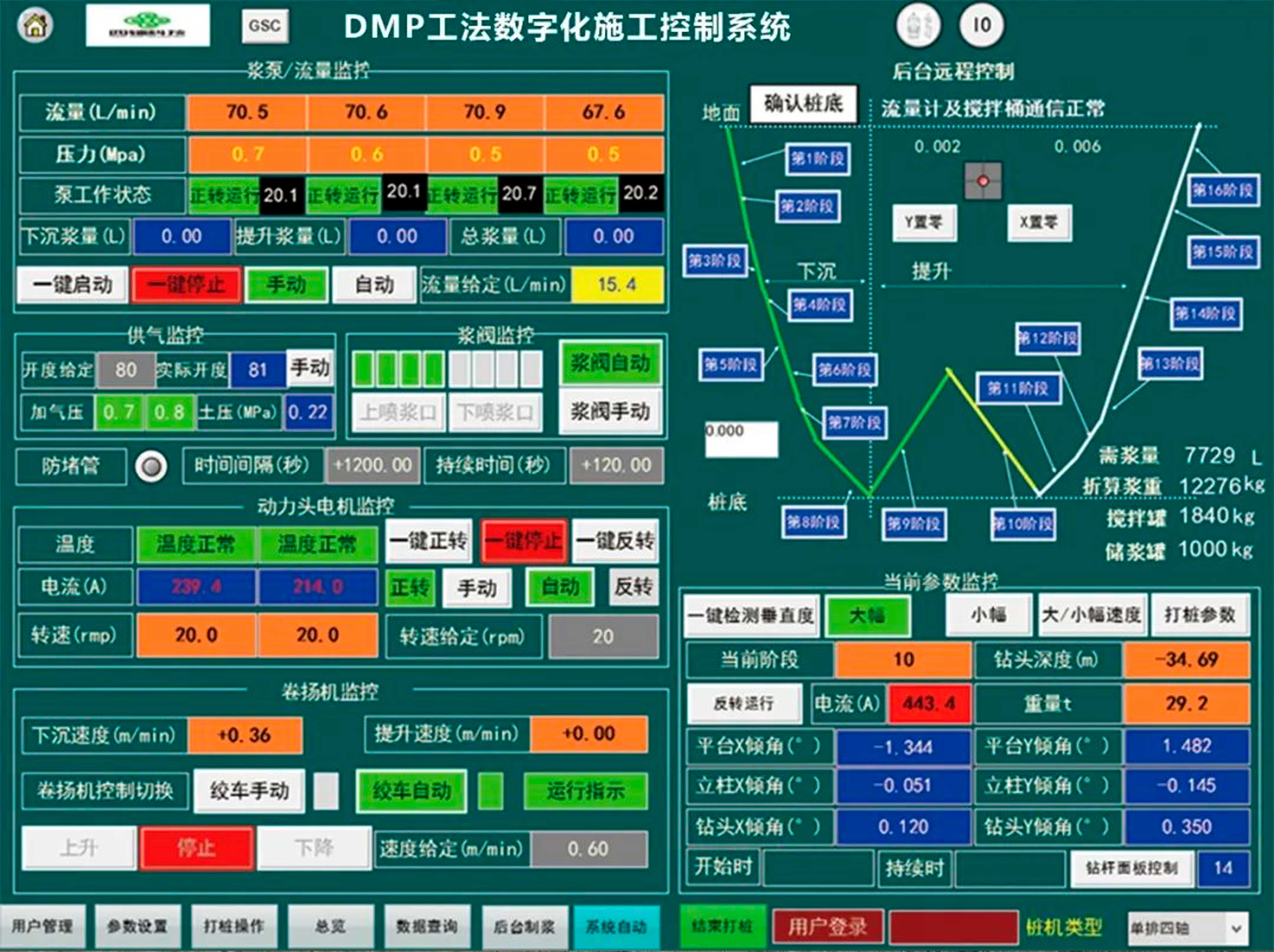 DMP工法攪拌樁設備采用智能(néng)的數字化施工控制系統,使得施工過(guò)程質量可控,大幅度提高了施工的便捷性,數字化施工控制系統采集并顯示的内容包括噴漿壓力、漿液流量、噴氣壓力、地内壓力、成(chéng)樁深度、成(chéng)樁速度、成(chéng)樁垂直度等參數;可生成(chéng)包含樁長(cháng)、施工時(shí)間、地内壓力、水泥用量、成(chéng)樁垂直度等參數的施工記錄表;同時(shí)可將(jiāng)施工參數上傳至集控中心,實現對(duì)施工過(guò)程的實時(shí)監控。