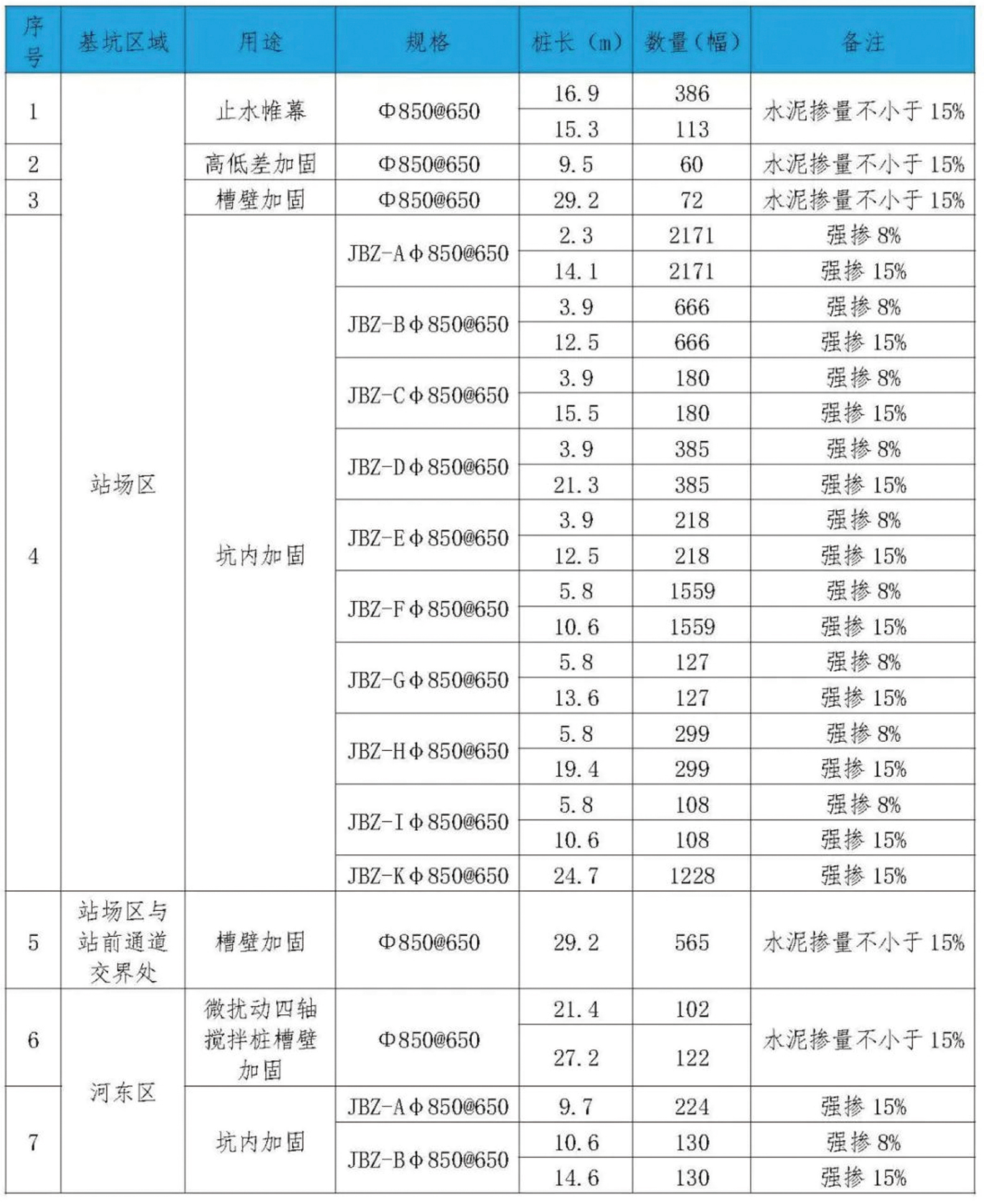 本次工程DMP工法攪拌樁主要用于站場區、站場區與站前通道(dào)交界處和河東區地下連續牆槽壁加固、被(bèi)動區加固以及坡體加固,工程采用“套接一孔法”進(jìn)行施工,現場所需攪拌樁總方量約37萬方,樁徑850mm,深度16~25m,其中站場區的止水帷幕總計499幅,高低差加固總計60幅,槽壁加固總計72幅,坑内加固12654幅;站場區與站前通道(dào)交界處槽壁加固總計565幅;河東區DMP工法攪拌樁槽壁加固總計224幅,坑内加固484幅。