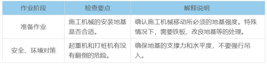 表 :(樁基礎的各作業階段中施工管理檢查要點)