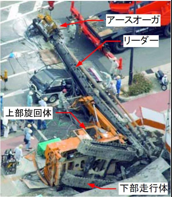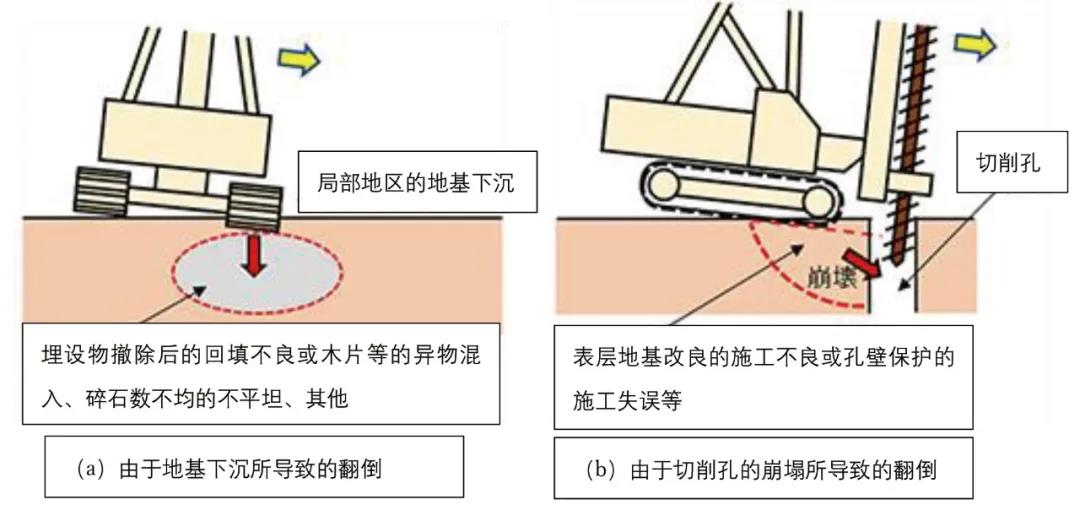 上圖中的三軸動力頭鑽孔機的翻倒事(shì)故,直接原因是表層地基改良不完備導緻的挖槽崩塌(參照下圖3(b))。