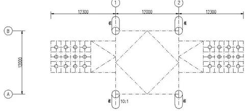 該項目由中石化勝利油建承接,井組平台的樁位布置如下圖。位于平台兩(liǎng)側的鋼管樁是海上石油鑽井的隔水管,樁徑660mm,樁長(cháng)79.75m,施工完成(chéng)後(hòu),樁入泥深度爲60m。由于設計變動,該隔水管的樁長(cháng)由原來的約60m增加到近80m,原拟采用的D138柴油錘無法滿足施工要求。而我公司的H260MT液壓錘以輸出能(néng)量/質量比大的優勢,正好(hǎo)滿足設計方的要求,力挑攻堅使命。
