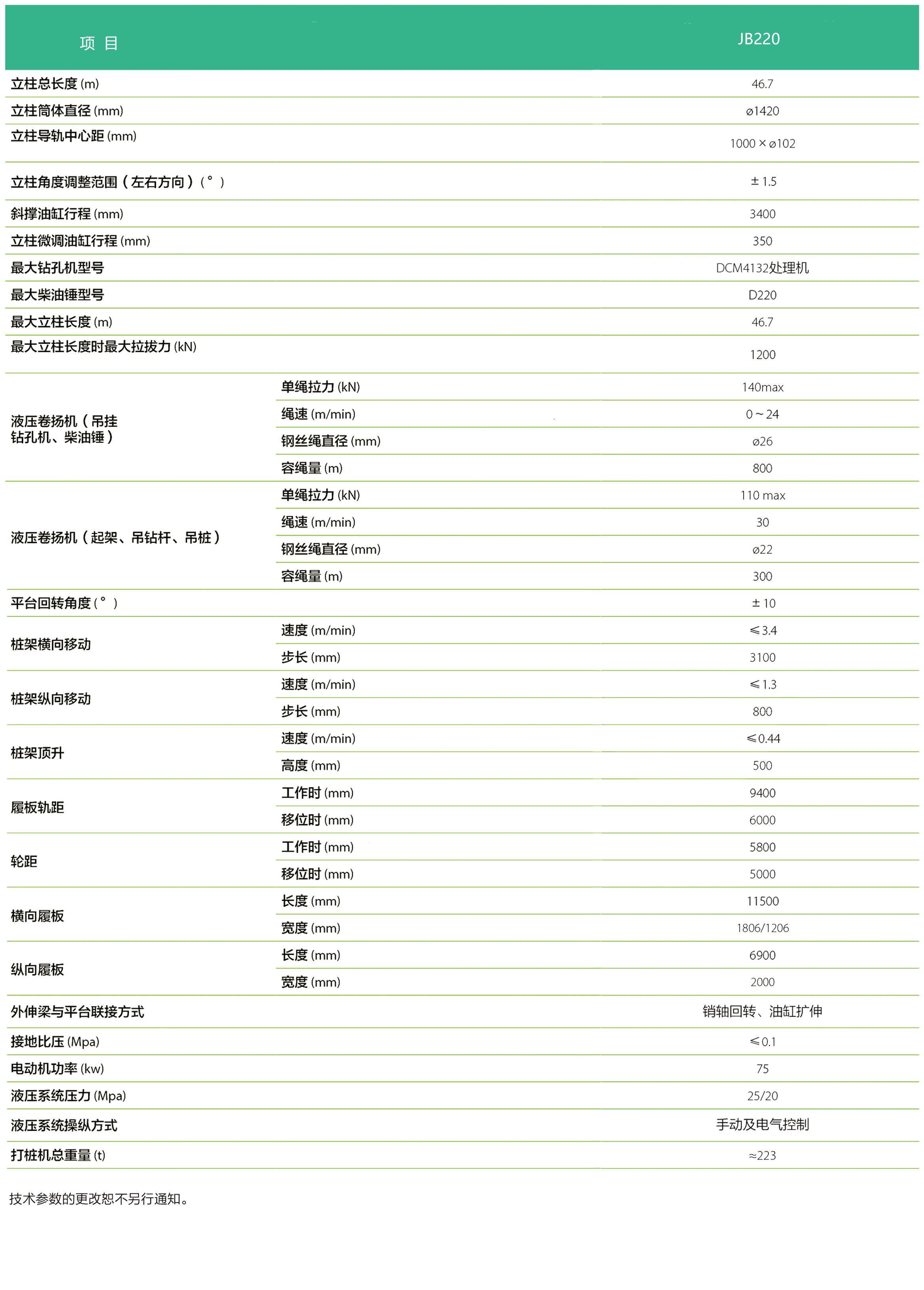 1. JB220打樁架主卷揚拉力達到14噸;陸上DCM處理系統專用樁架。