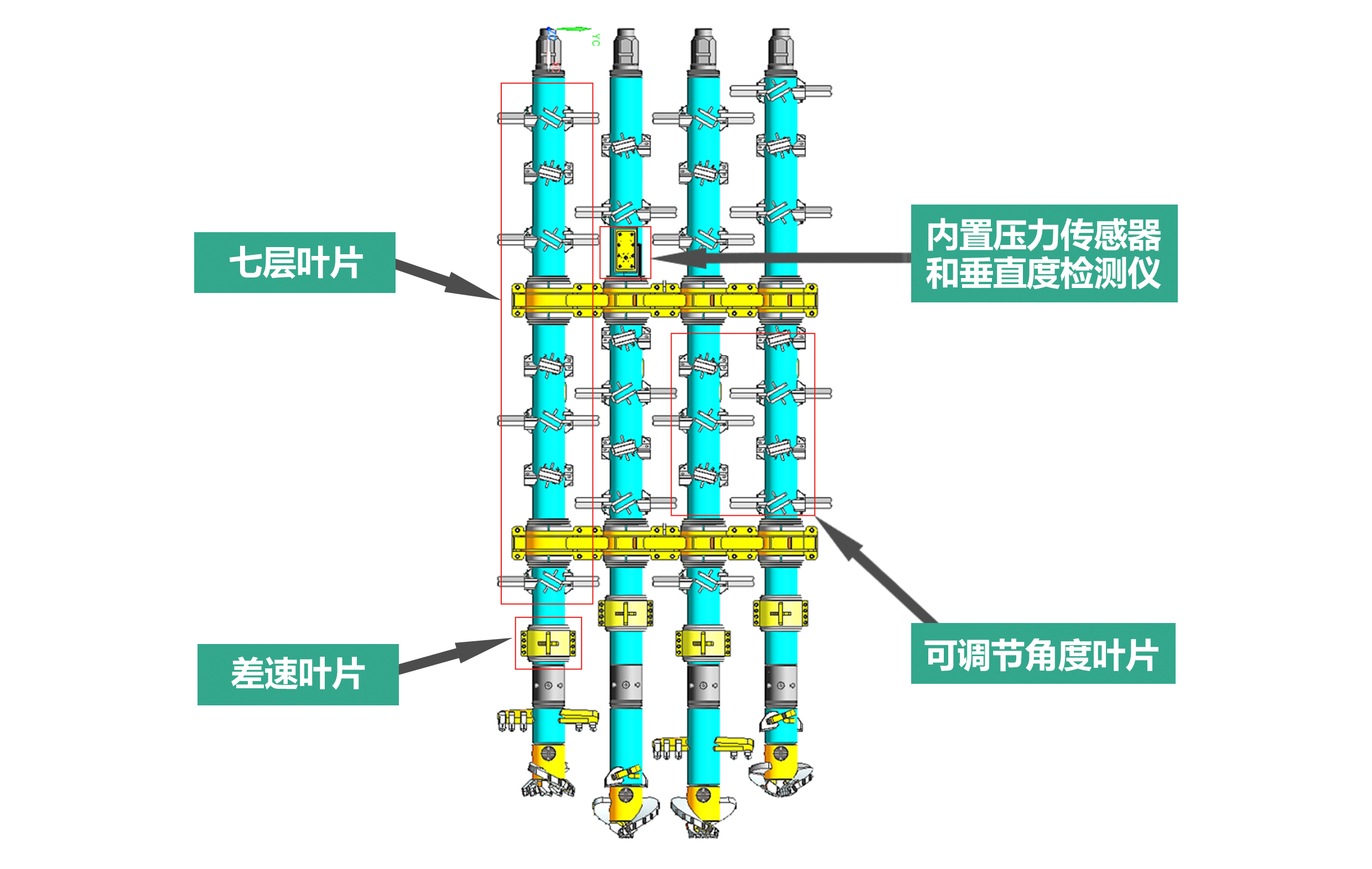 攪拌鑽頭配置攪拌葉片爲7層,葉片切削角度可調節,配有1層差速葉片,攪拌鑽頭内部配置有地内壓力傳感器和垂直度檢測儀。