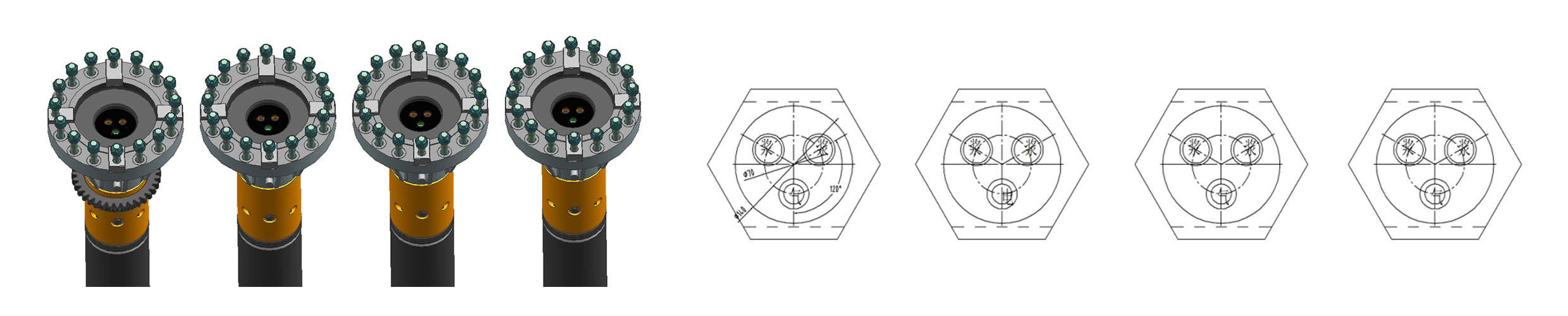 ●多通道(dào)異形鑽杆,包含上、下噴漿管和噴氣管的多通道(dào)非圓形鑽杆;