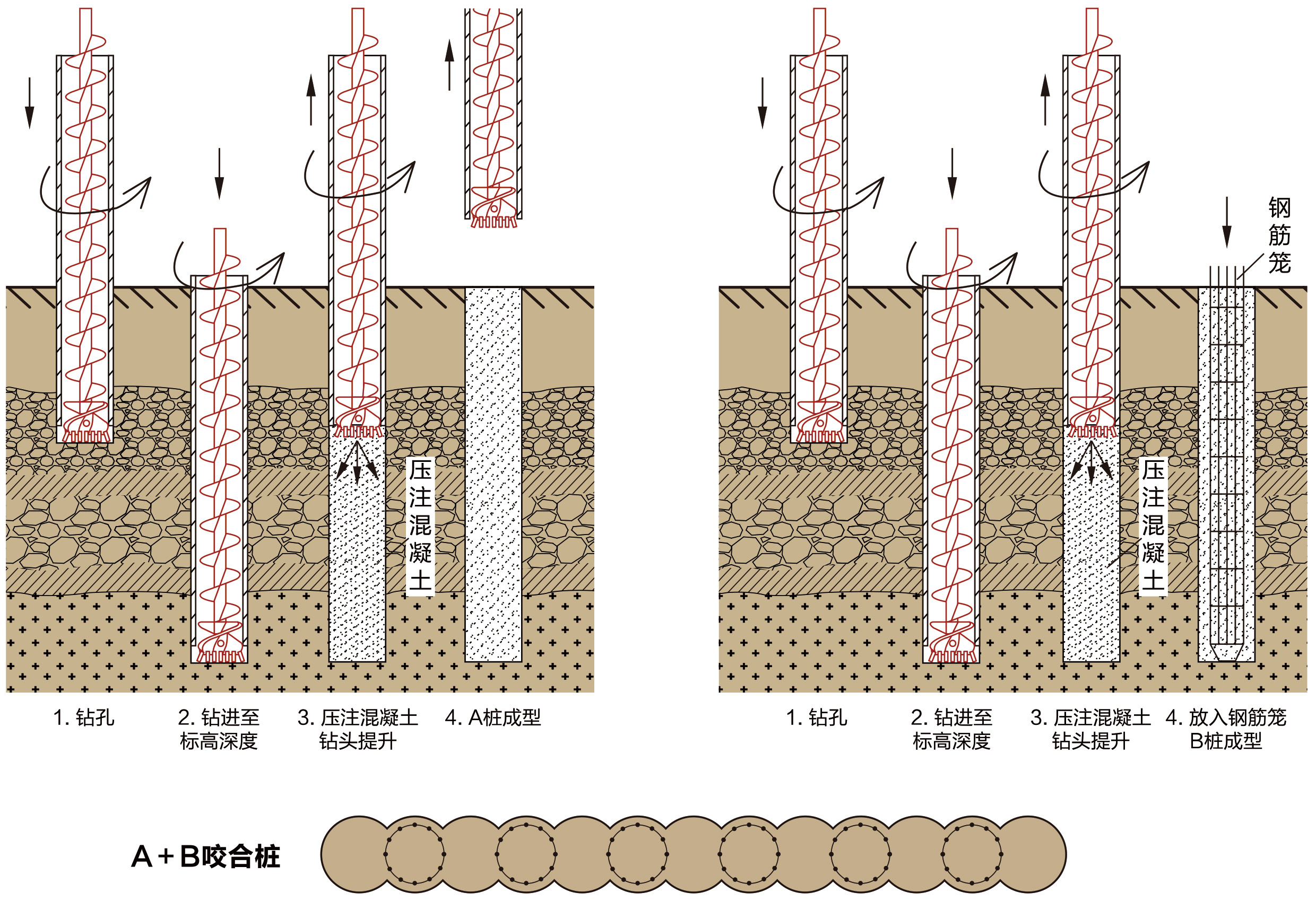 鑽孔灌注樁、咬合樁、鋼管樁、鋼管 複合樁、壓灌樁、CFG、CFA樁、中掘 壓入管樁、廢舊樁基礎清除處理等。