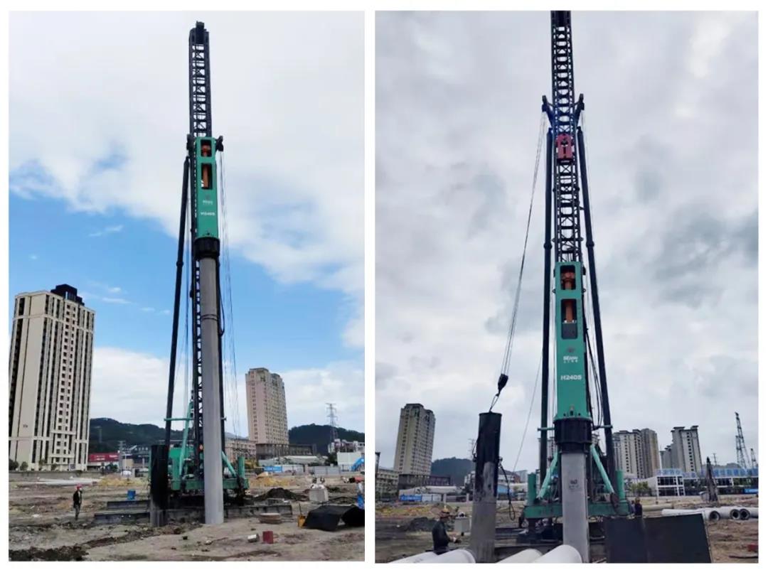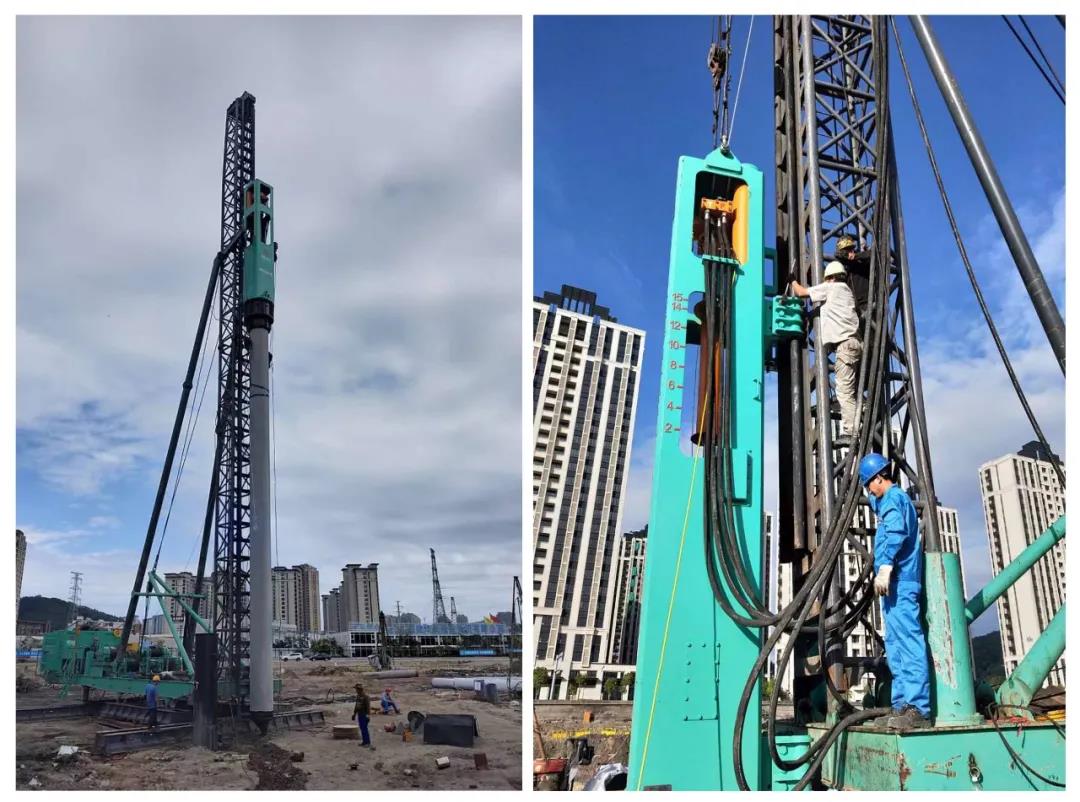 據悉,廈門同安寶龍城項目由廈門展皓地産有限公司承建,該項目施工做樁總量307根,樁徑爲500mm的PHC管樁,2節一套樁深28-29米,目前已完成(chéng)200餘根。由于工程量比較大,入場同類設備有11台,上工機械H350MF液壓錘擁有雙作用力的技術特點沉樁效率在同類産品中優勢明顯,平均一天沉樁可達15套,從衆多樁工機械中脫穎而出,力挑攻堅使命。
