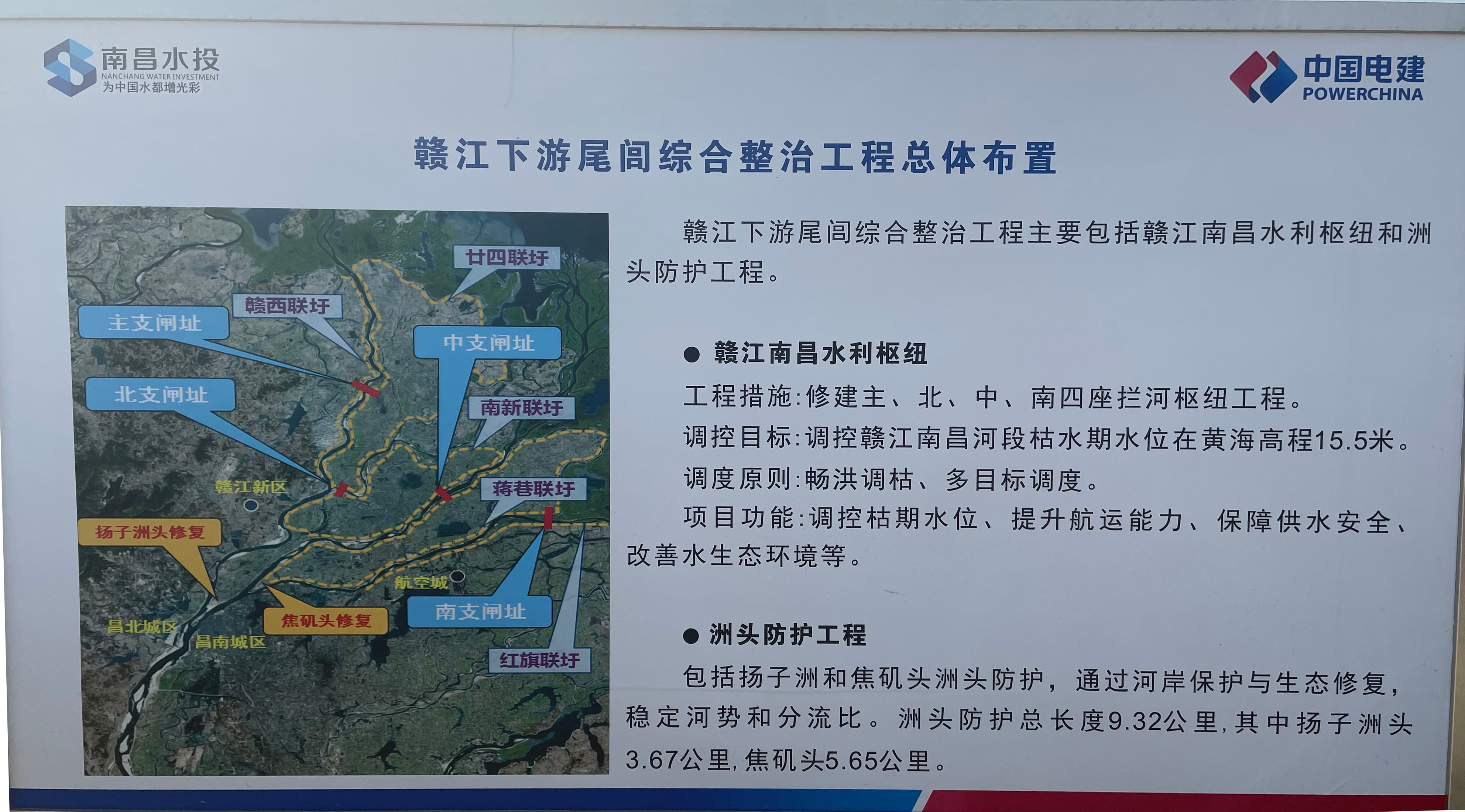 整治工程由贛江南昌水利樞紐工程、洲頭防護工程兩(liǎng)大部分組成(chéng): ●贛江南昌水利樞紐工程 工程措施:修建主、北、中、南四座攔河樞紐工程; 調控目标:調控贛江南昌河段枯水期水位在黃海高程15.5米; 調度原則:暢洪調枯、多目标調度; 項目功能(néng):調控枯期水位、提升航運能(néng)力、保障供水安全、改善水生态環境等。 ●洲頭防護工程 包括揚子洲和焦矶頭洲頭防護,通過(guò)河岸保護與生态修複,穩定河勢和分流比。洲頭防護總長(cháng)度9.32公裡(lǐ),其中揚子洲頭3.67公裡(lǐ),焦矶頭5.65公裡(lǐ)。